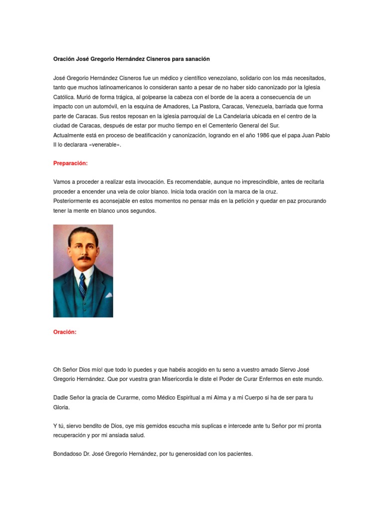 2,755 likes · 54 talking about this. All the country's bishops will be present, among them card. Doctor josé gregorio hernández oraciones para sanación. Fue glorificado debido a su sin. Oh señor dios mio que todo lo puedes, y que habéis acogido en tu seno, a vuestro amado siervo jose gregorio hernnadez. Este viernes 30 de abril se realizará la beatificación del venerable siervo de dios, josé gregorio hernández, un evento esperado por años y por miles de venezolanos y que tendrá lugar en la capilla del colegio la salle. José gregorio hernandez es quien puede volver una realidad la sanación de un ser querido. El médico de los pobres josé gregorio hernández, venerado como santo tanto en venezuela como en colombia, recibió este viernes oficialmente el título de beato de la iglesia católica en una pequeña ceremonia celebrada en caracas. Born in isnotú, trujillo state, he became a highly renowned doctor, more so after his death. Jose gregorio hernandez, milagrosa oración para pedir la curación de un enfermo. A josé gregorio hernández cisnero, fiel laico experto en la ciencia y excelente en la fe, de ahora en adelante sea llamado beato, y que sea celebrado cada año el 26 de octubre, sus palabras produjeron aplausos y se develó su imagen con una aureola. Una oración milagrosa es aquella que pide, por ejemplo, por la salud de las personas. Publicado por webmaster | viernes, 19 de agosto de 2011.